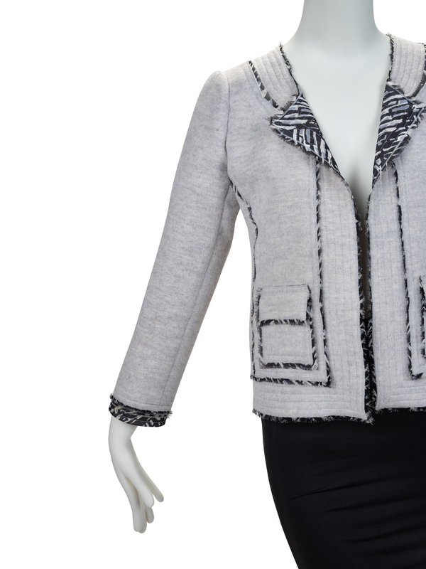 Grey orylag and wool blended jacket with peaked lapels, set in long sleeves, grey and black fringed silk trim, two front flap pockets, and open front. Fall 2010