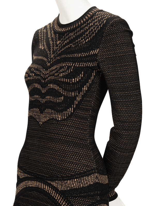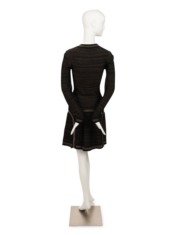 Black and brown rayon knit flare dress with eyelet and abstract pattern, crew neckline, and set in long sleeves.