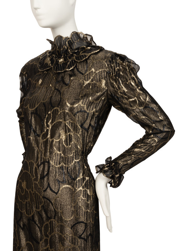 Black and gold layered woven long dress with flower shaped flounce collar, black and gold flower pattern, long poet sleeves, side slit, and back zip closure.