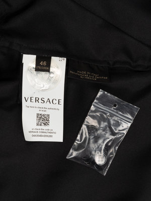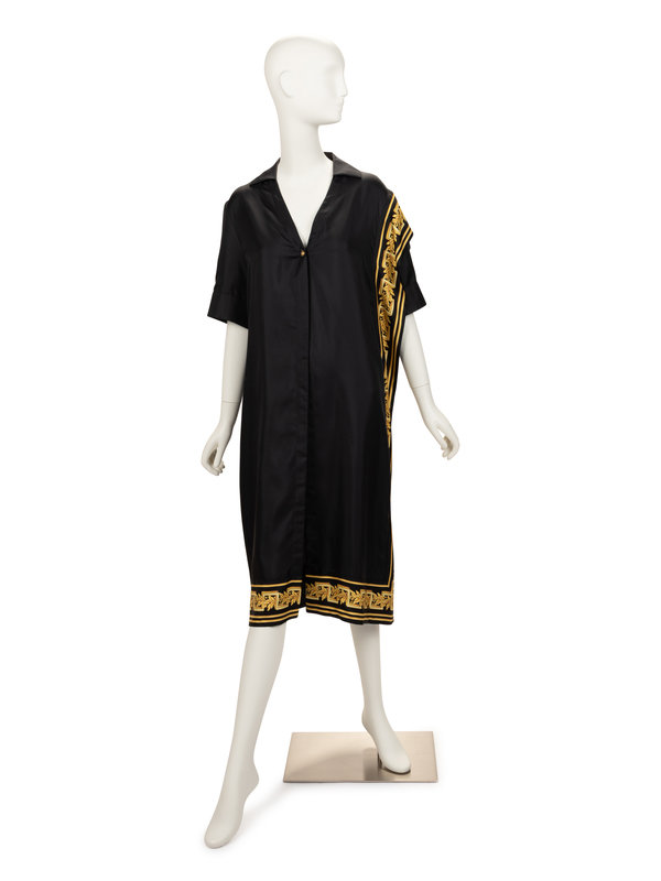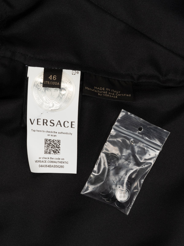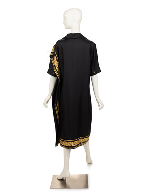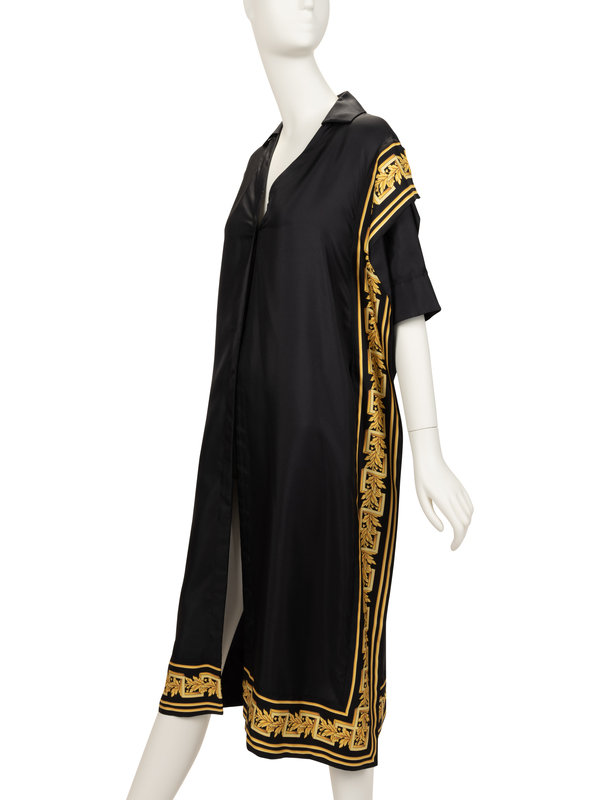 Black silk jacket with v-neckline, spread collar, set in short sleeves, side flap and hem with gold print, and single button front closure.