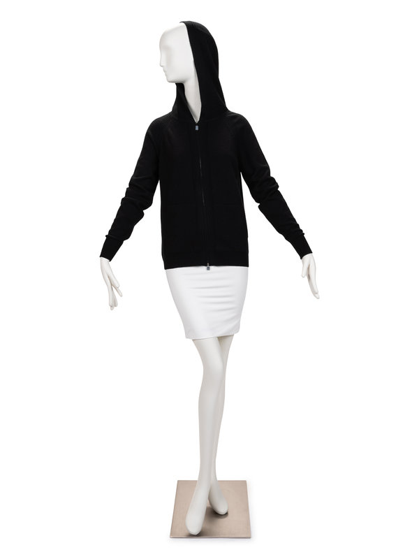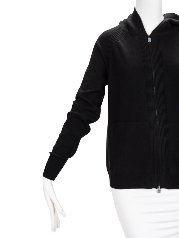 Black knit cashmere hooded sweater with long sleeves, two front welt pockets, black loosely knit trim, and center front zipper closure.