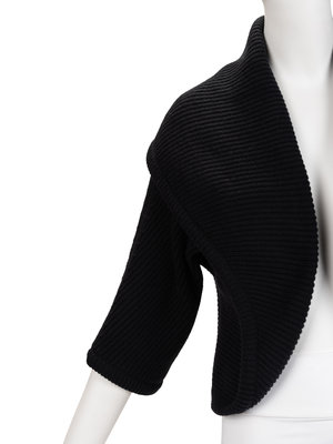 Black cashmere knit jacket with large fold over collar, three quarter length sleeves, and open front.