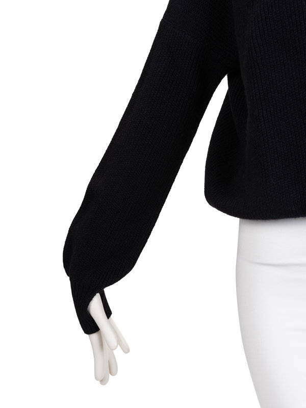 Black wool/cashmere blended knit cowl neck sweater with set in dropped long sleeves with thumbholes, and tighter knit trim.
