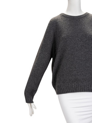 Grey cashmere knit sweater with tighter knit trim, crew neckline, and raglan long sleeves.