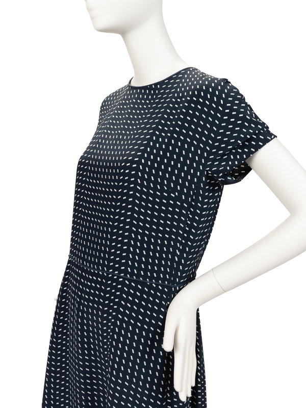Navy blue silk a-line dress with crew neckline, short sleeves, blue cord waistband, white rectangular printed pattern, two front hip flit pockets, and center back zipper closure; paired with matching navy blue silk slip.