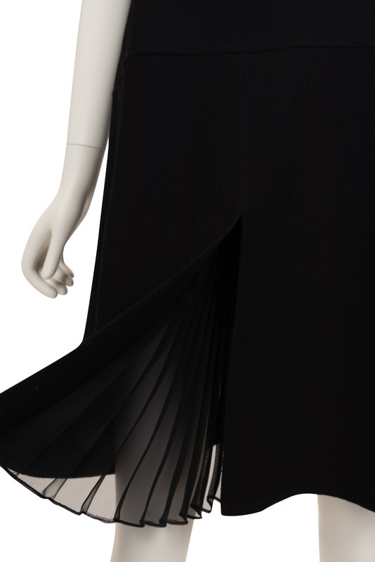 Black wool sleeveless a-line dress with scoop neckline, center front accordion mesh kick pleat, and center back zipper closure. 2015