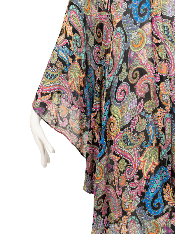 Multicolored viscose paisley printed poncho fitted at the side seams with a 14.5 inch length seam down the right and left sides, along with v-neckline, and asymmetrical hem.
