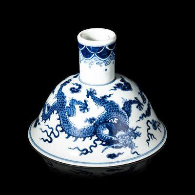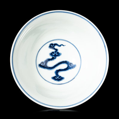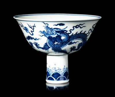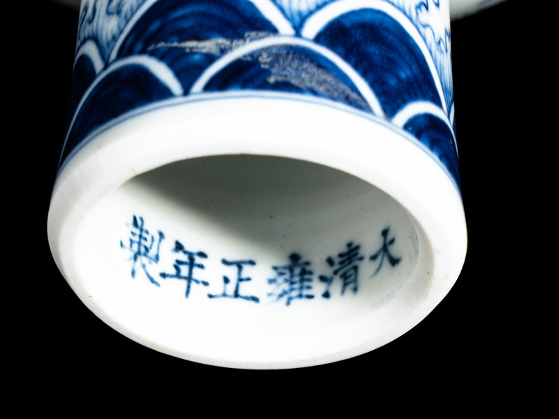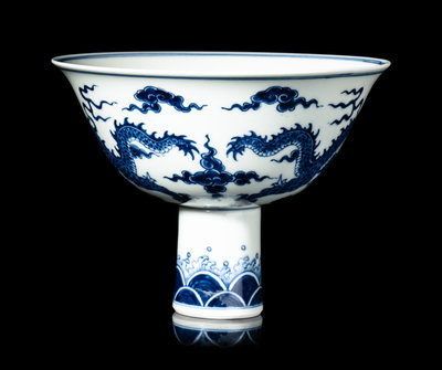 the exterior superbly painted in brilliant tones of cobalt blue depicting two ferocious five-clawed dragons, one charging forward, the other looking back, the stem foot decorated with cresting waves, the interior center is inscribed with a Yongzheng mark in underglaze blue.