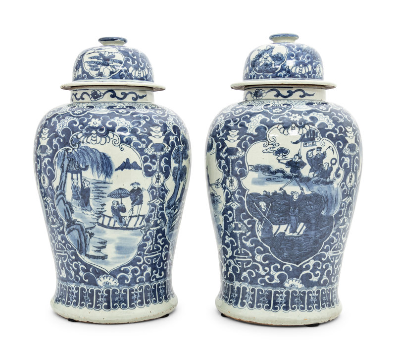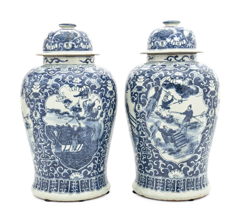清 青花人物故事圖將軍罐一對