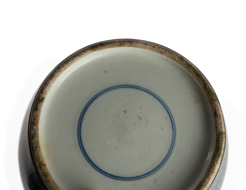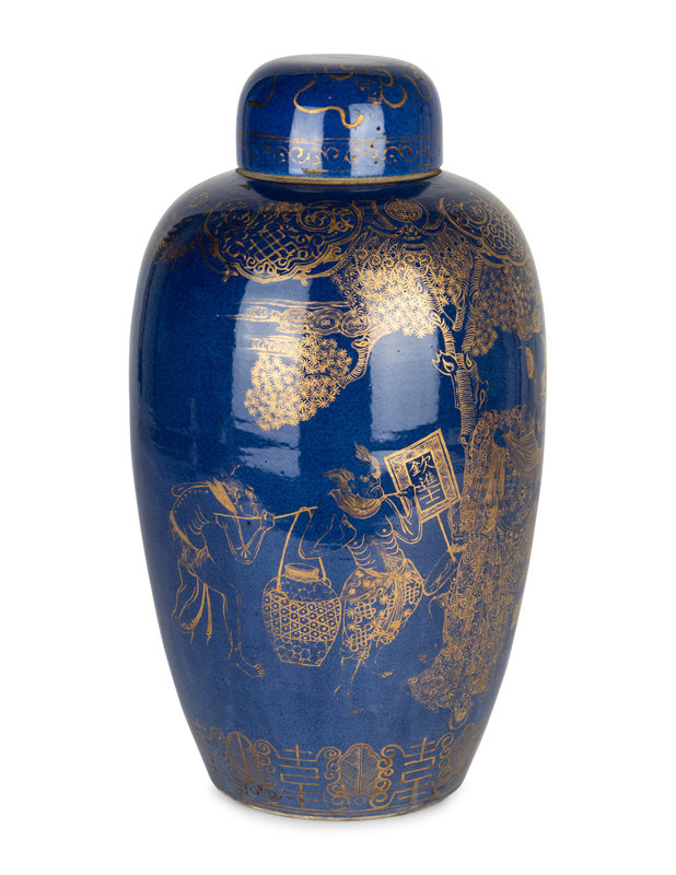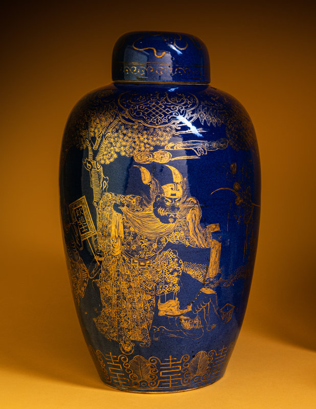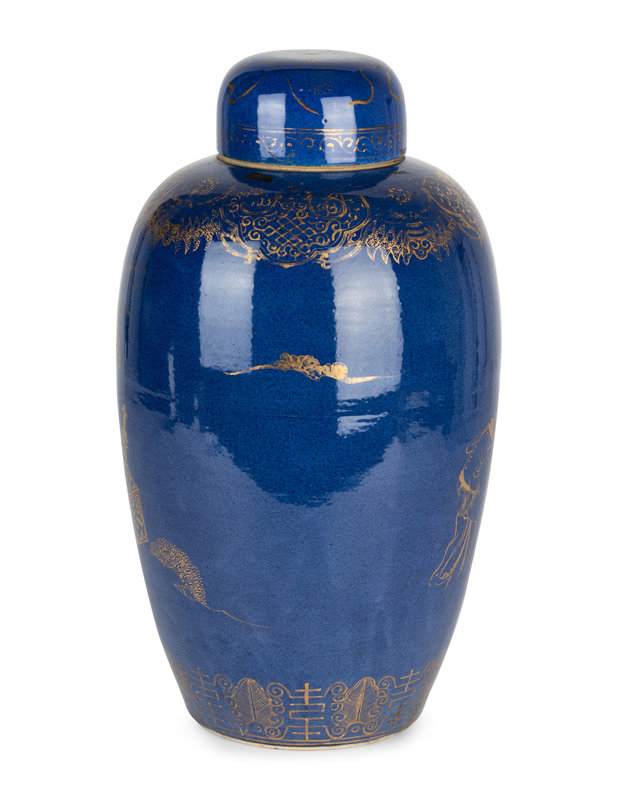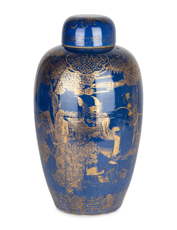 A Well-Painted Gilt-Decorated Powder Blue 'Zhong Kui' Covered Jar