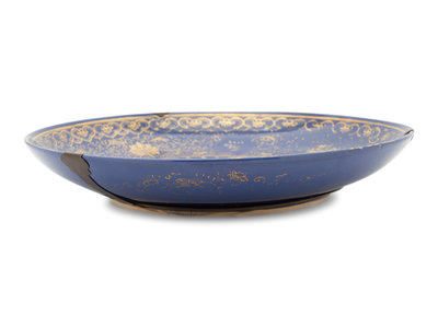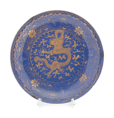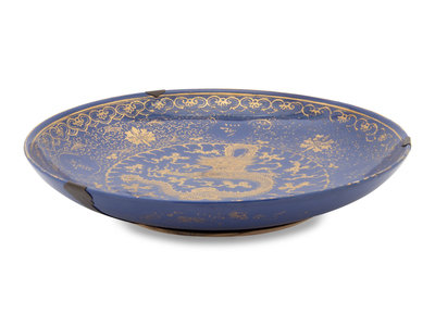 A Large Gilt Decorated Powder Blue Glazed Porcelain Charger