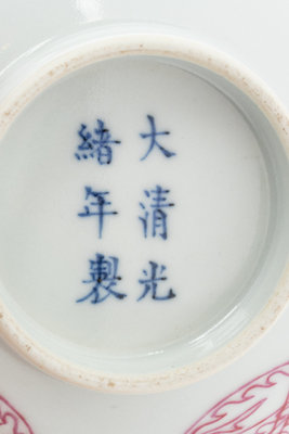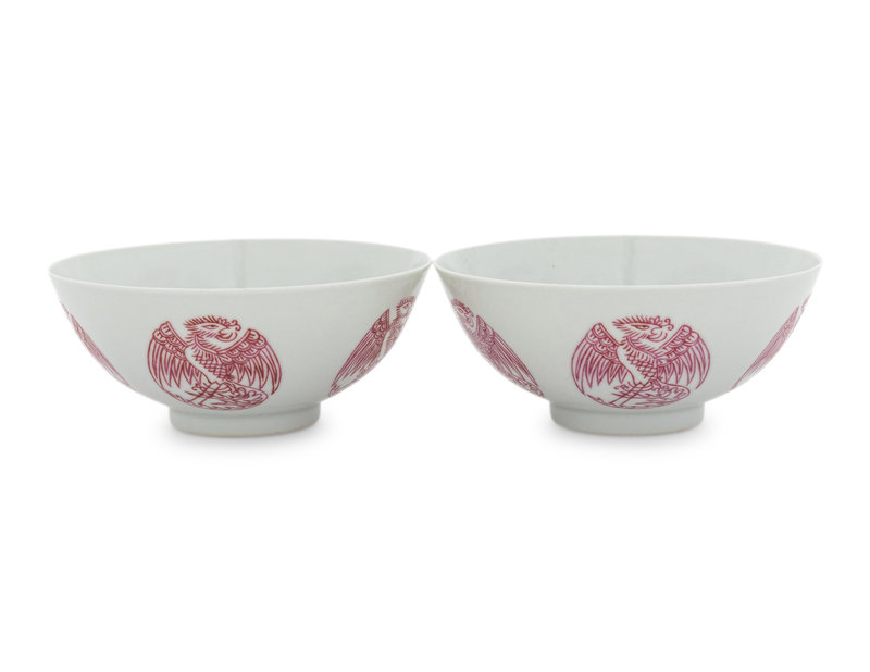 A Pair of Pink Enameled Porcelain 'Phoenix' Bowls