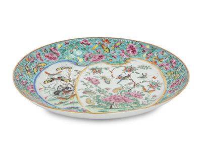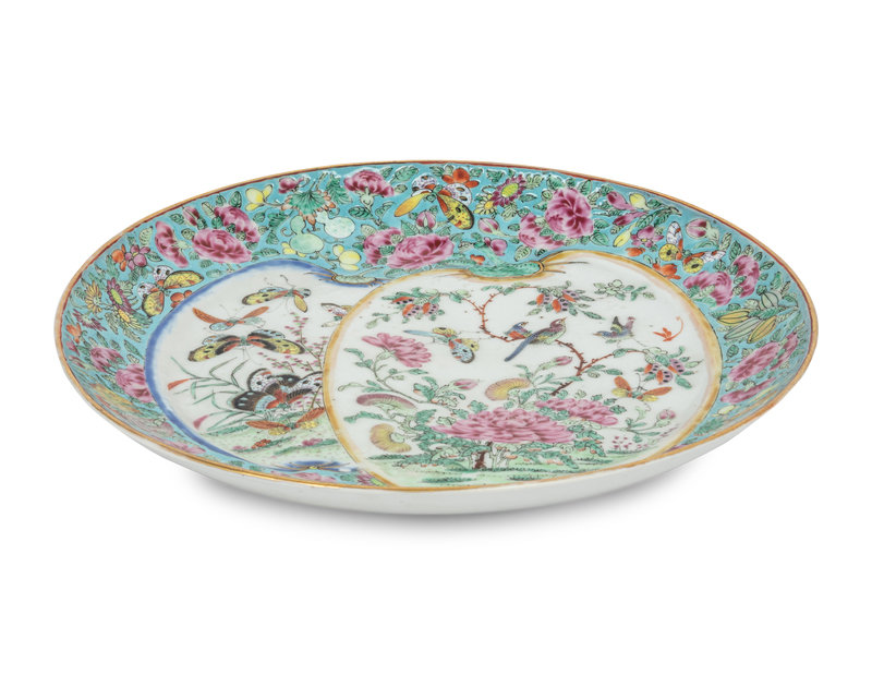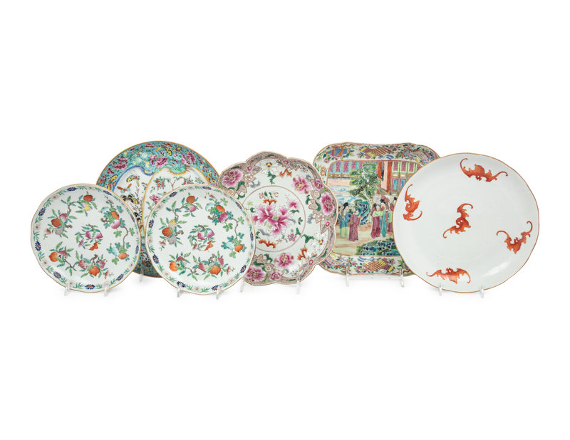 comprising one rounded example painted with soaring bats, a pair of gilt decorate foliated examples painted with fruiting branches, a floriform 'peony' dish, a gilt decorated 'birds and butterflies' example, and a square rose medallion dish.