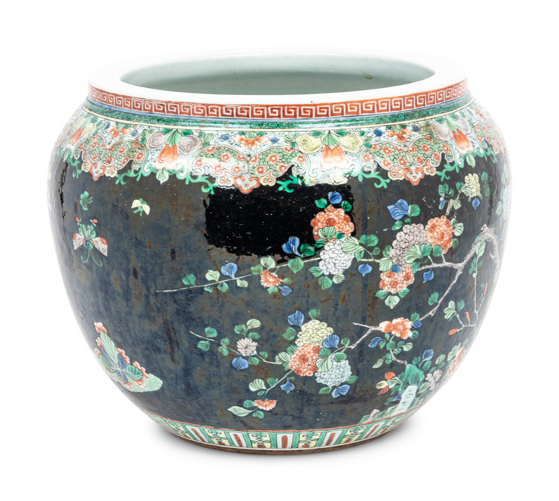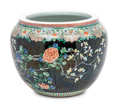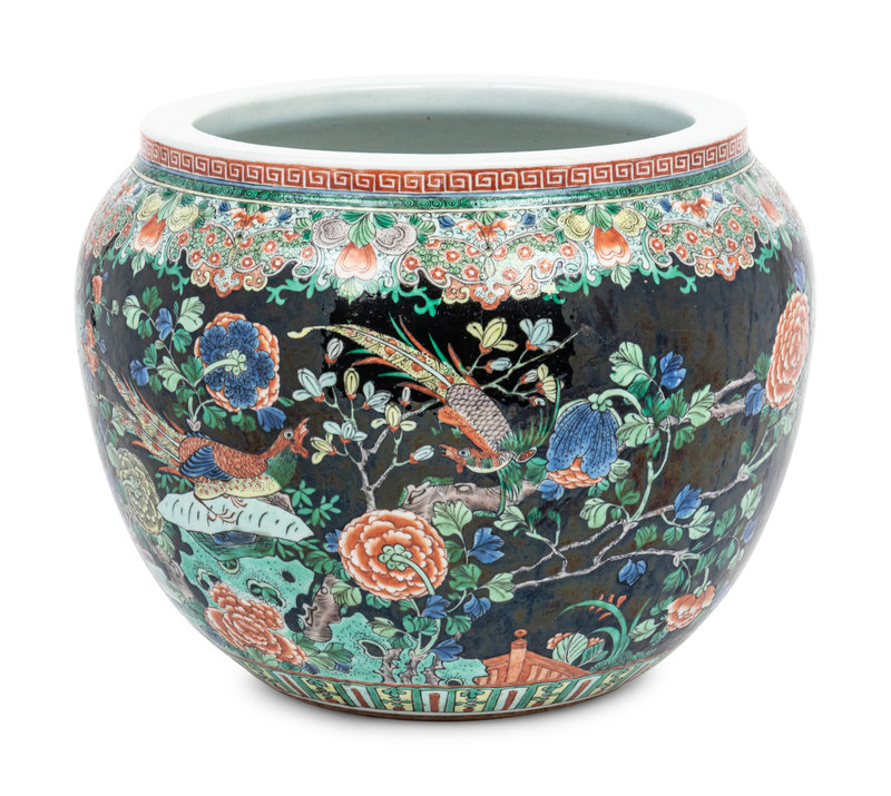 of bulbous form, with deeply rounded walls rising to a squared mouth rim. Deftly painted to the exterior with squawking birds among rich foliage and rockery beneath scrolling and keyfret borders.