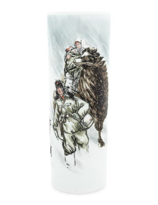 having tall, straight walls, painted to the exterior showing a soldier walking next to a camel bearing a mother and a child on its back.
