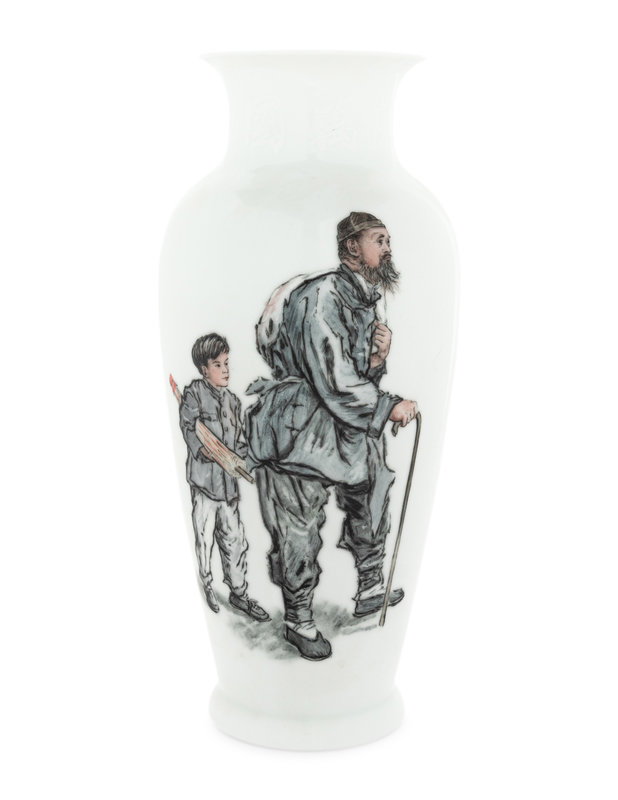 having broad shoulders tapering to a spreading foot, surmounted by a recessed neck and a flared mouth, the front painted with an elderly man and a young boy, the reverse caved with inscriptions.