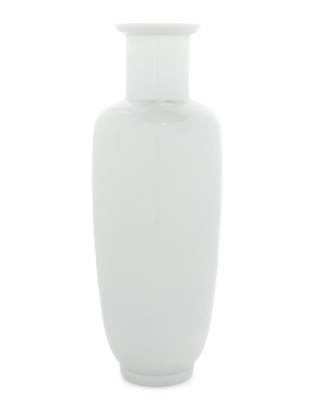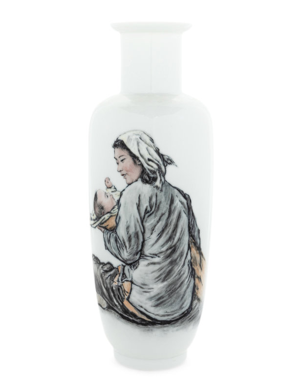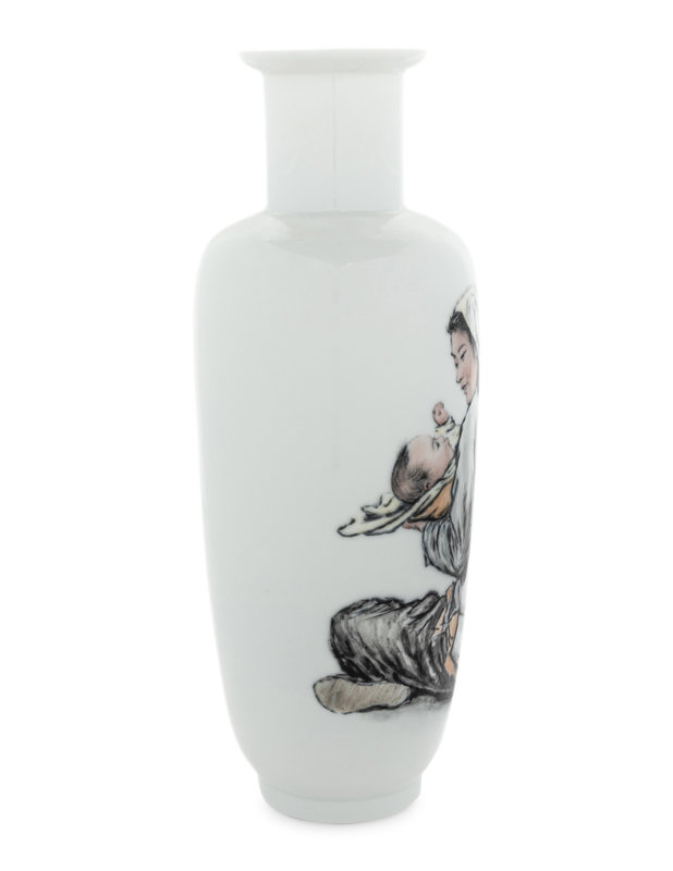 of tall baluster form, the body painted opposite incised verse with a palette of blues, greys, and taupe-toned enamels to show a figure of a rosy-cheeked seated woman embracing a cherubic infant; the underside bearing a mark for the porcelain research institute, Zhong Nan Hai Xi Hua Ting.