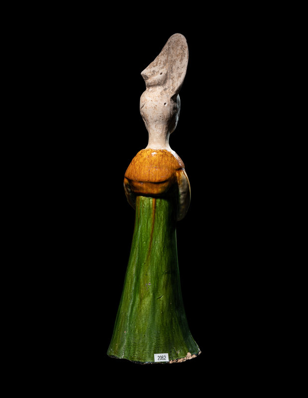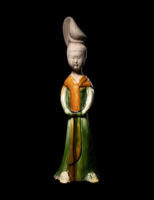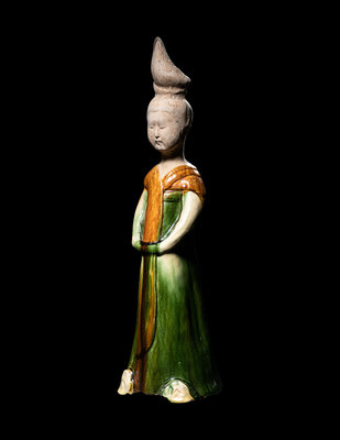 depicted with slender arms gathered above her belly, dressed in long green glazed robes and long shawl of honey amber tone, the hair swept in a lofty coiffure above her cherubic face, both unglazed showing a rosy biscuit.