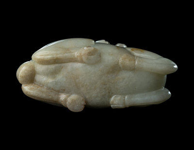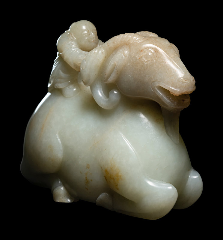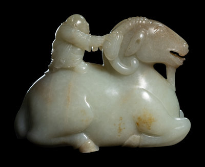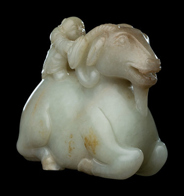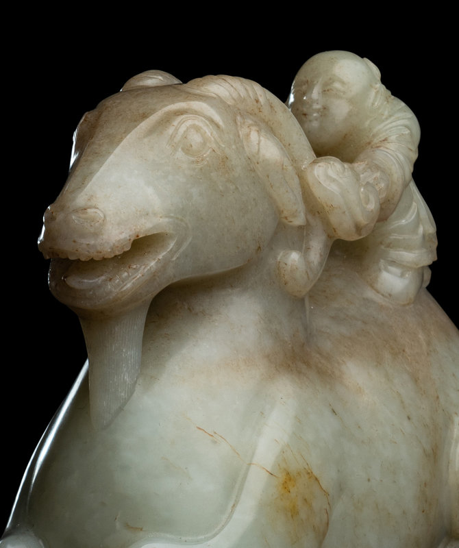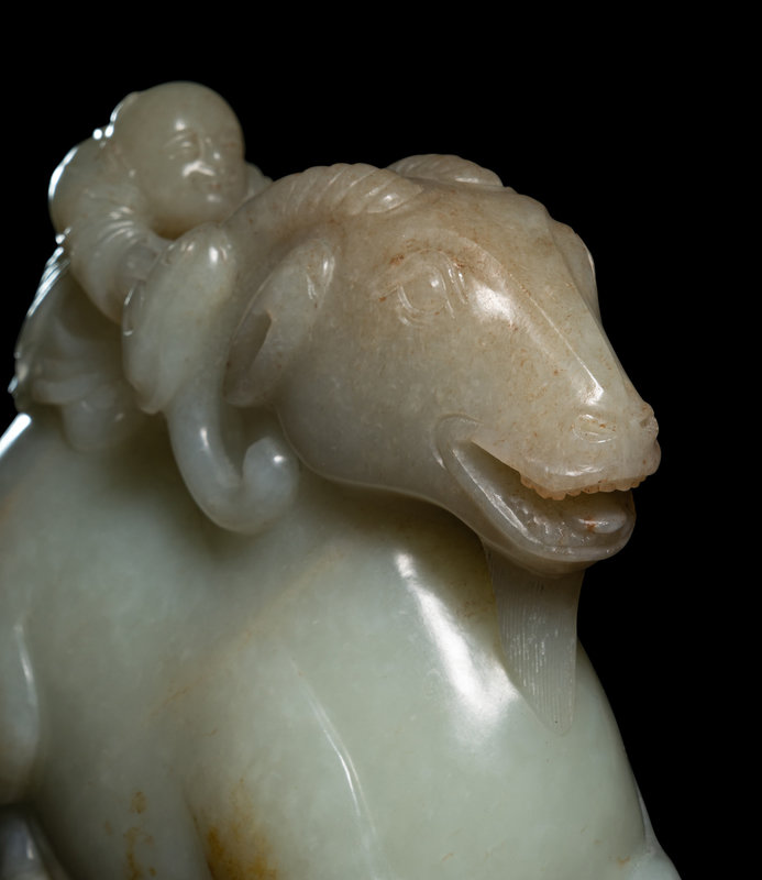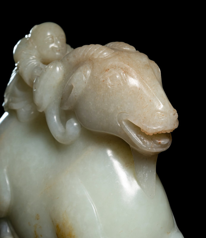the pale matrix worked in the form of a recumbent ram with the four legs tucked under and head held high and mouth agape. The muscular hindquarters supporting a kneeling boy, with arms outstretched with a lingzhi sprig, grasping to drive the beast at its furling lobed horns.