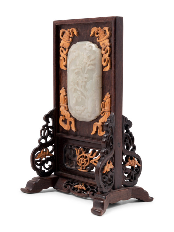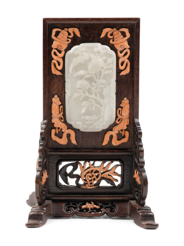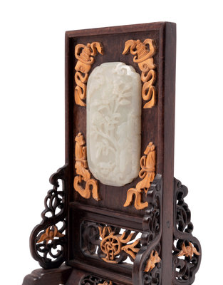 A Carved White Jade Inset Hardwood Table Screen