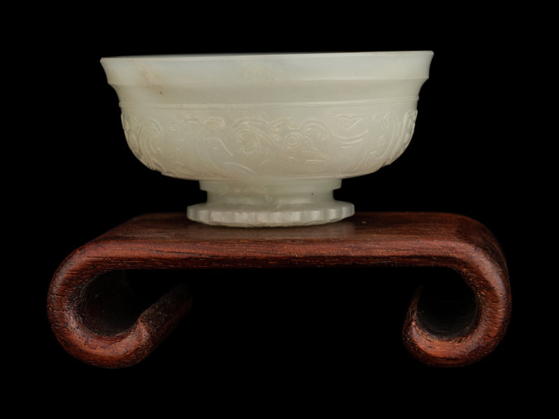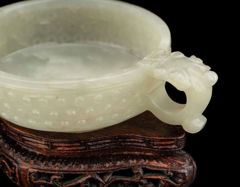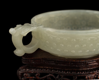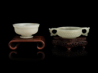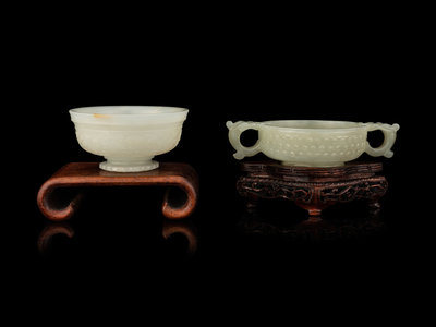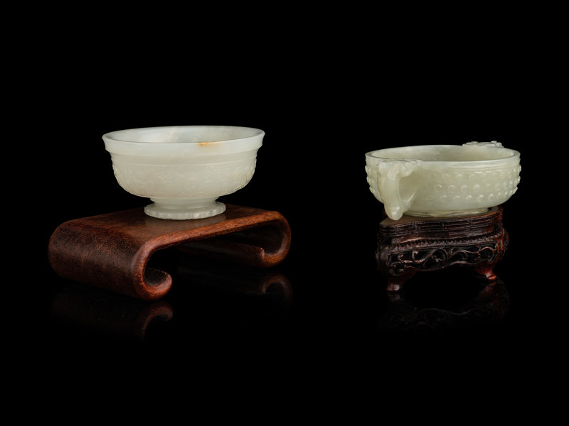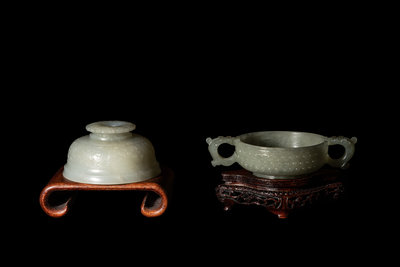 the first cover of a censer, carved in low relief with an archaistic band, the semi-translucent stone is of even pale celadon tone, the second a double-handled cup and carved with rows of bosses.