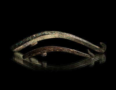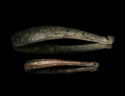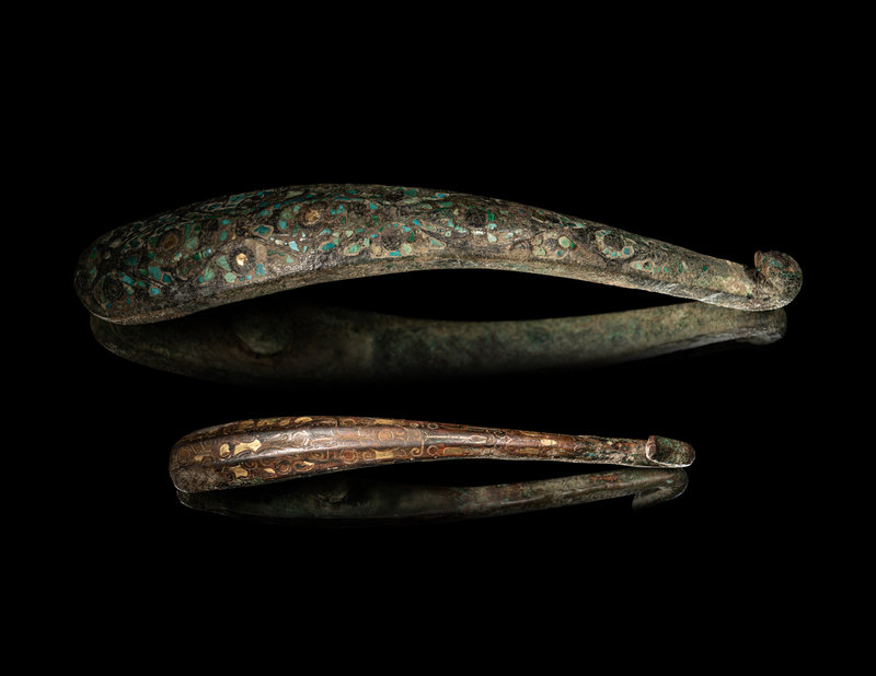 both have arched shafts slightly tapering towards the dragon's head hooks, the reverse of each with a knop for attachment, the first decorated with gold and silver sheet and wire inlay reserved against the rich coppery color of the bronze, the second inlaid with turquoise.