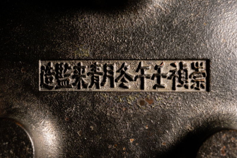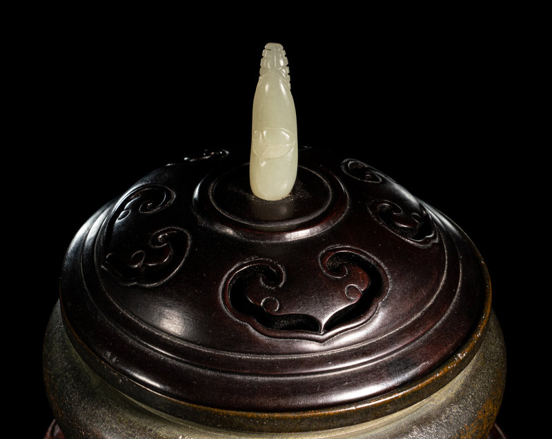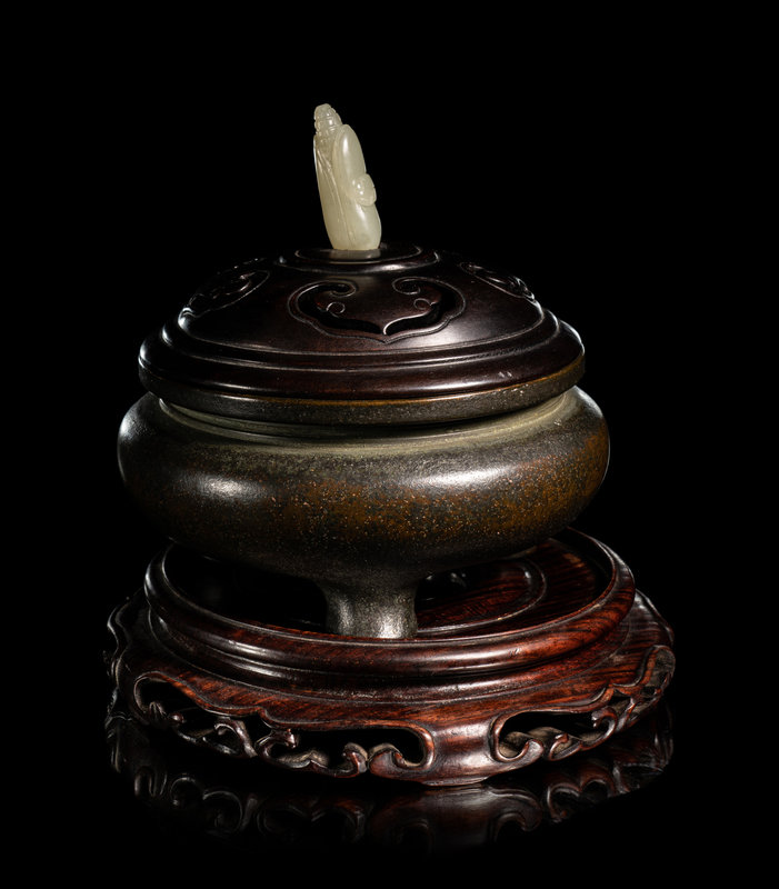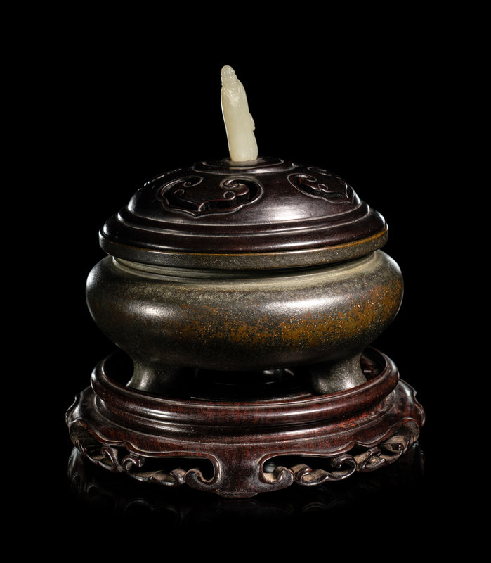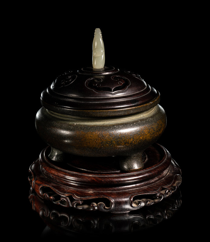 of compressed globular shape with three cabriole feet, supported on a separate wood stand, the underside of the censer is cast with a ten-character mark,