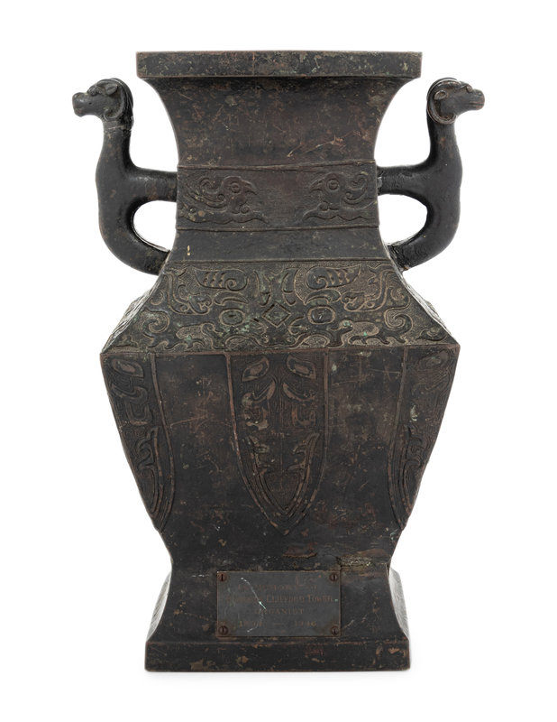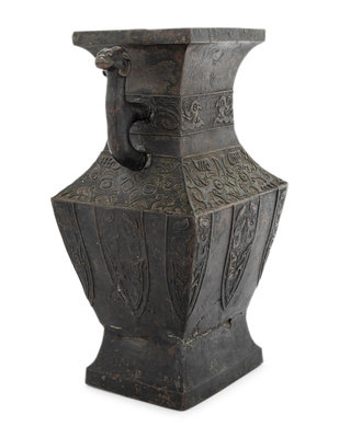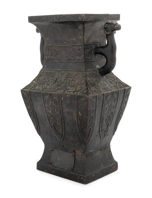 of rectangular section, the angular body rising with sharp shoulders and a curvilinear neck flanked by undulate-form handles.