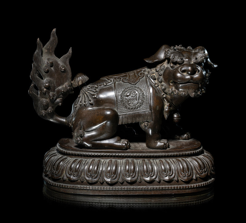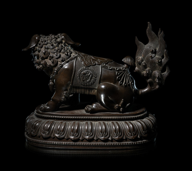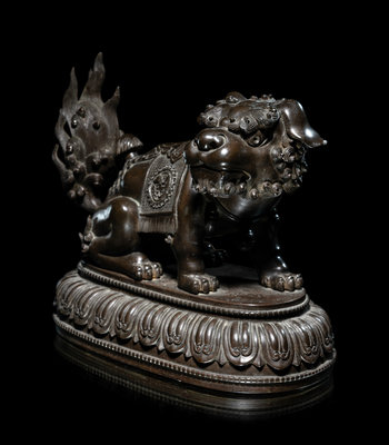 in reclining position with turned head and upright tail, ferocious expression and curly manes, atop a lotus pedestal.