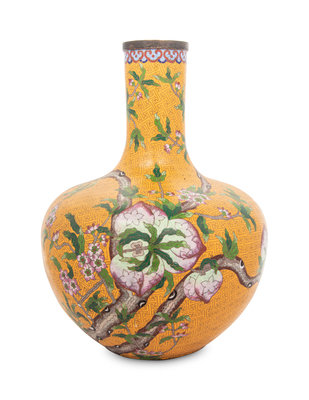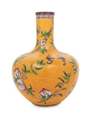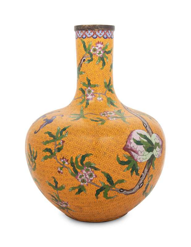 民國 元善堂款黃地萬字不到頭福桃紋掐絲琺琅天球瓶