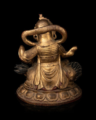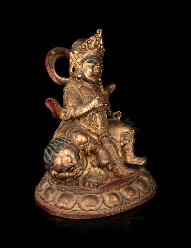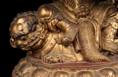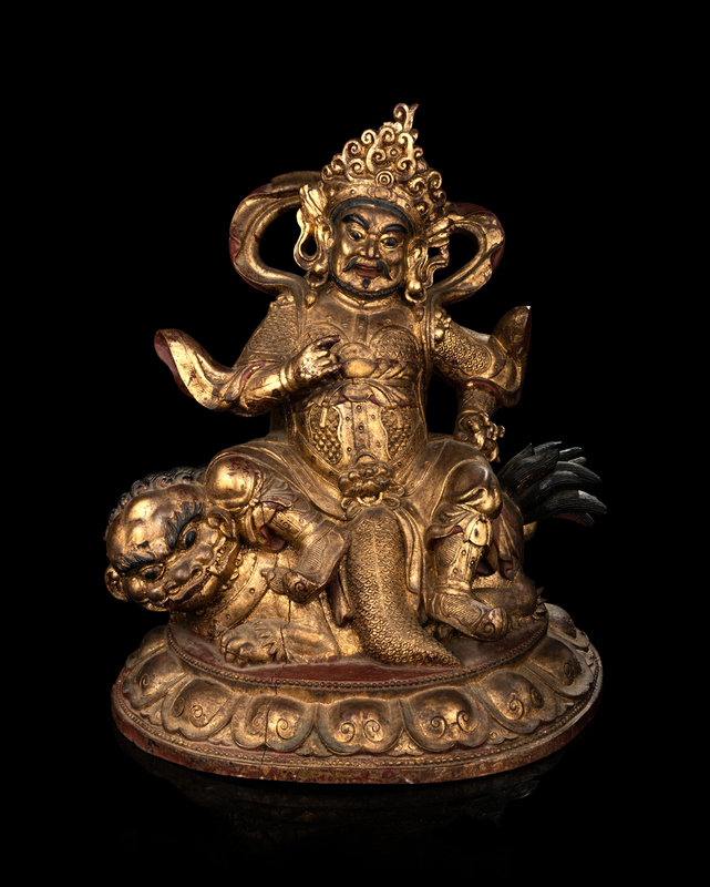 A Large and Rare Sino-Tibetan Gilt Lacquer Wood Figure of Vaishravana