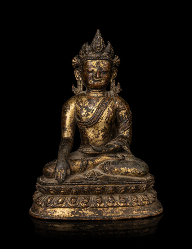 the serene figure seated in dhyanasana, his hands resting in bhumisparsa mudra, right fingers grazing the ground; smiling peacefully, his round head surmounted by a crown and dressed in modest robes; resting atop a double lotus plinth.