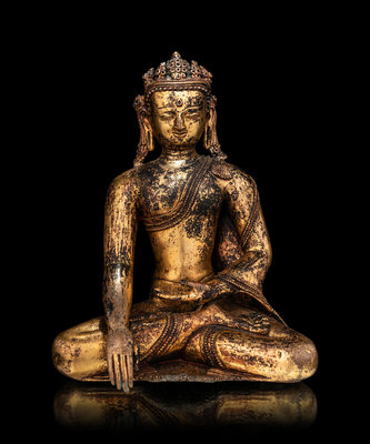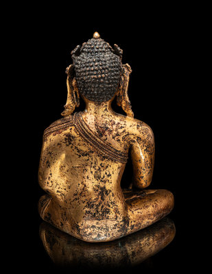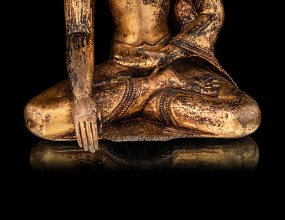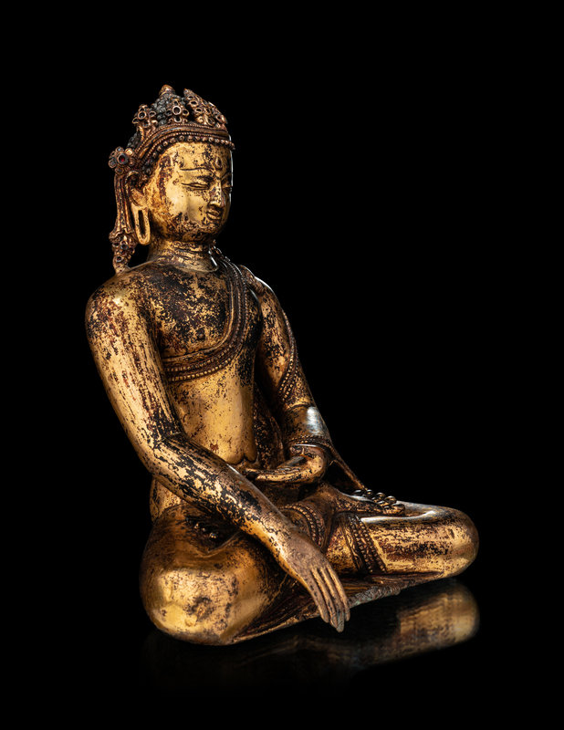 the stylized figure having a narrow torso and sturdy arms, the right hand grazing the ground in bhumisparsamudra, the left hovering at the navel in dhyanamudra; the deity appearing peaceful with broad facial features, elongated earlobes, and adorned with an ushnisha, urna, and crown.