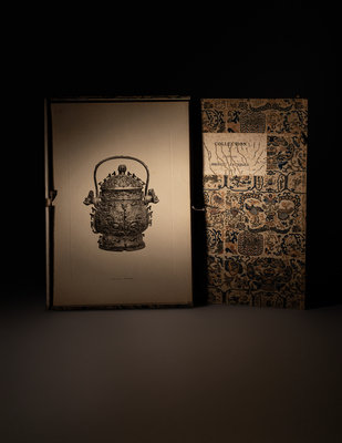 開本極大,印刷極精。書函選用古色古香的棉麻織物,紋飾有唐風。出版時間1910,嵗在晚清,較濱田耕作1920年代《泉屋清賞》與梅原末治1933年《支那古銅精華》早許多。全書收錄青銅器近五十件,五十多張珂羅版大圖散頁,歷經百十年而纖毫畢現,另附銘文及器物圖案拓影一冊,細載名稱、年代、尺寸、藏者及相關說明。此書是日本商周銅器研究者私下編印的圖錄,未曾公開發行,市場罕見。