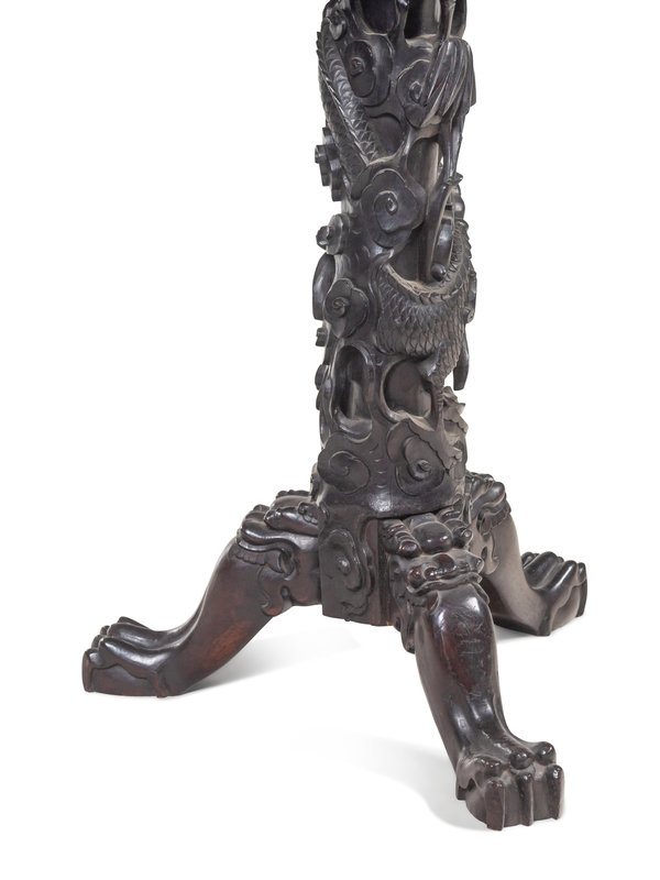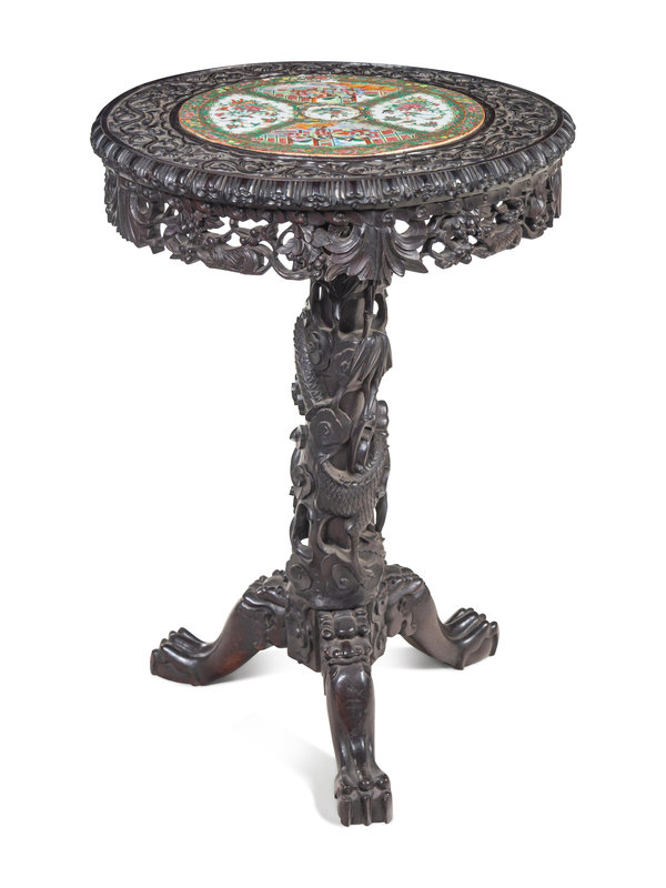 the circular plaque painted with ladies in garden settings with birds and butterflies divided in four floriform bordered reserves, all inset in a sectioned carved hardwood tabletop circumnavigated by reticulated aprons pierced with squirrels eating grapes; and supported by a central post carved with dragons terminating in three claw feet.