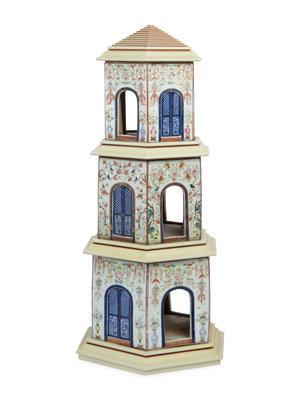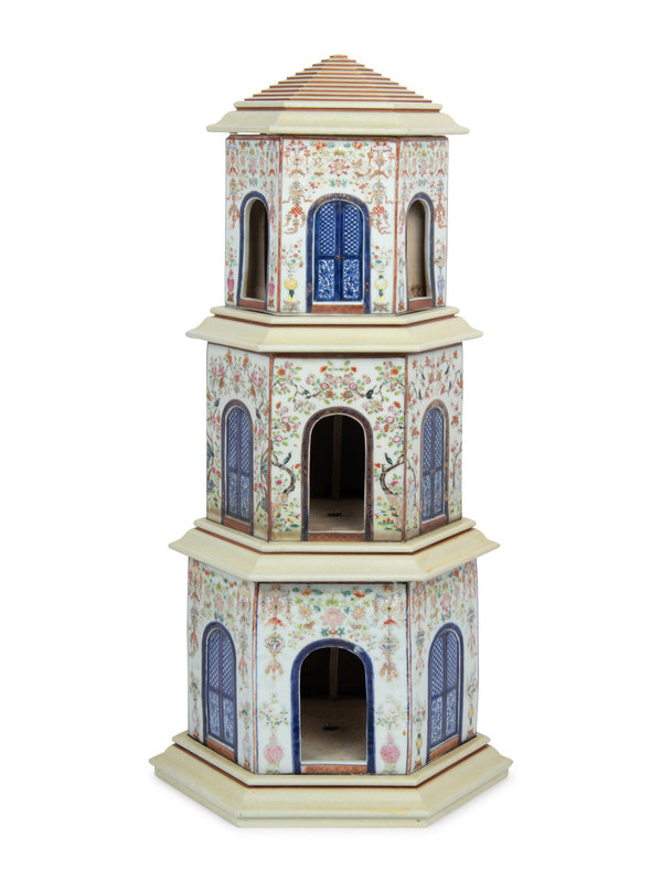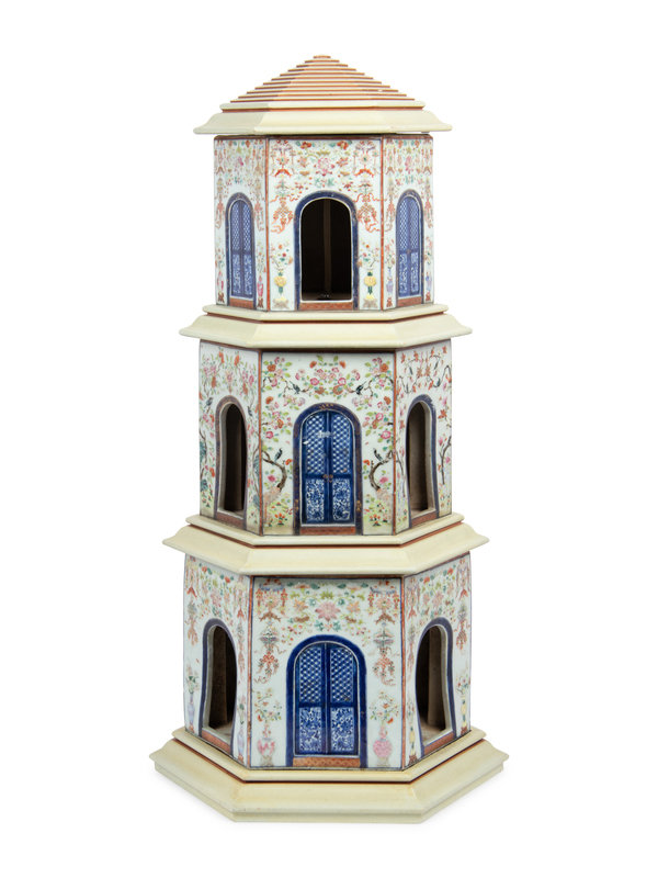 in three sections, each of hexagonal form, finely painted to show magpies perched on flowering branches with fruiting pomegranate, lotus scrolls flanked by strands of auspicious emblems including double fish, interlocking lozenges, butterflies and endless knots above flower-filled vases, all enclosing open doors and windows in underglaze blue with gilt highlights; together later white painted wood cover and stand.