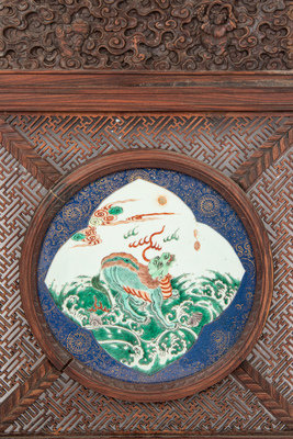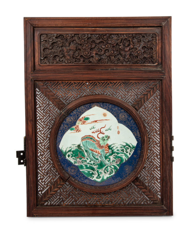A Famille Verte Porcelain Plaque Inset Wood Wall Panel