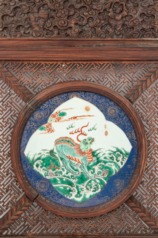 清晚期 木嵌紅綠彩麒麟閙海瓷板挂屏