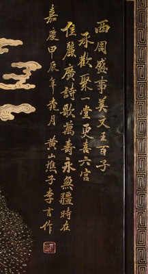 款識:西宮盛世美文王,百子承歡聚一堂。更喜六宮佳廣,詩歌萬壽永無疆。時在嘉慶甲辰年桃月。黃山樵子孝言作。