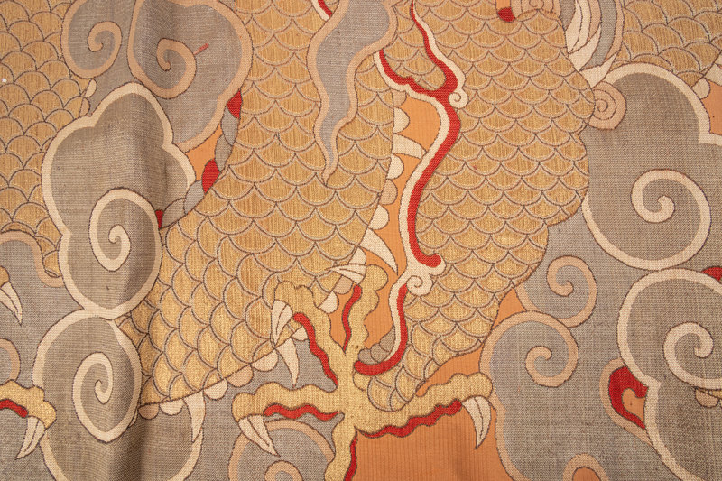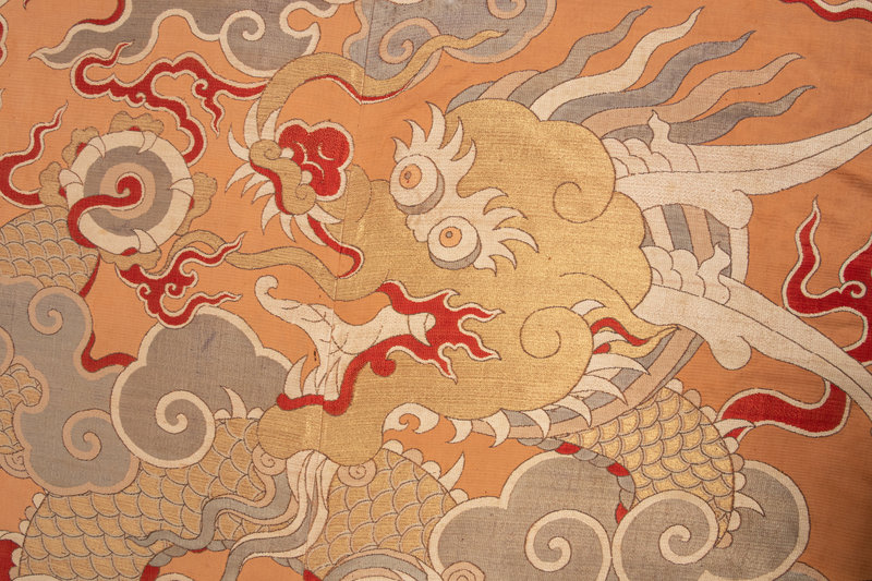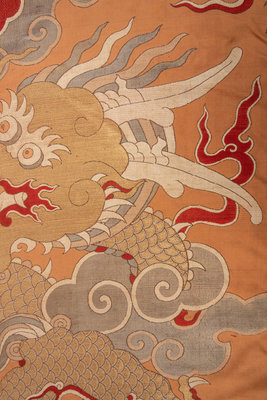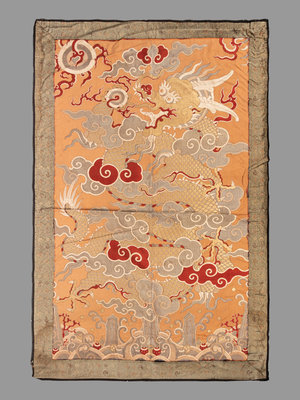 of rectangular section, densely woven with pale metallic, white, and details of red floss into the ground of warm apricot to dominate the vertical space with the serpentine coils of a large dragon's body boring through puffs of spiralized clouds, its gaze fixed upon a flaming pearl held aloft within its five-clawed foot and the whiplike firey wisps concentrating near a second, larger pearl in the sky; the rear feet stretching out below towards a narrow terrestrial diagram marked with rolling waves tossing amid daggerlike mountains and forking coral branches; the whole bordered with gold ground brocade and black trim.