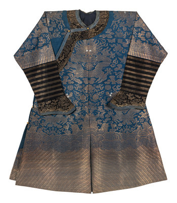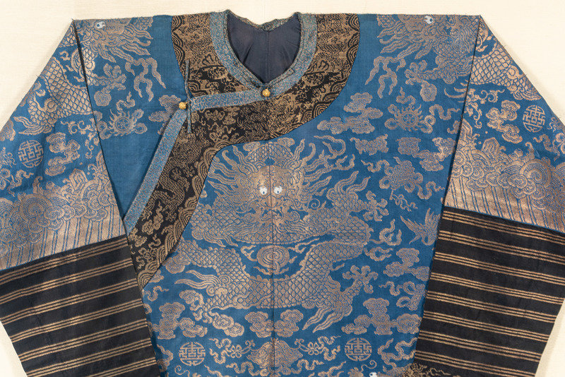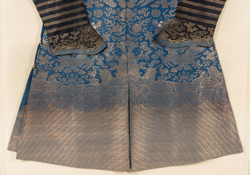 the garment densely worked with fine gilt-wrapped threads integrated in the blue ground to show a central front-facing dragon and others in profile, the bulging eyes picked out in white, all pursuant of flaming pearls all amidst beribboned auspicious emblems, shou medallions, cloud puffs, and peony sprays, with a wide undulating lishui strip at the hem beneath frothy spiralized waves tossing against trident mountain peaks, the sleeve with the same pattern before ribbed guards and horseshoe cuffs; the whole framed and glazed.