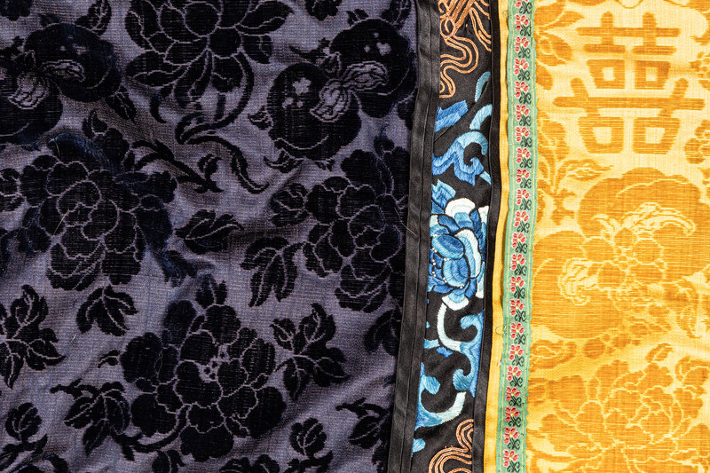 centrally organized with open side vents and toggle closure bordered with black satin trim embroidered with blue flowers and gilt scrolls running continuously across the hem, further detailed with a narrow ribbon outline against the richly toned fabric cut with a repeating pattern of peonies and bats. The wide cuffs of golden yellow cut with 'double happiness' characters against botanical ground bordered with a narrowed trim as the hem; the whole lined with tawny fitch pelts extending at the collar as a hood.