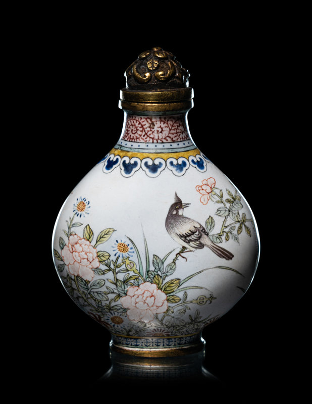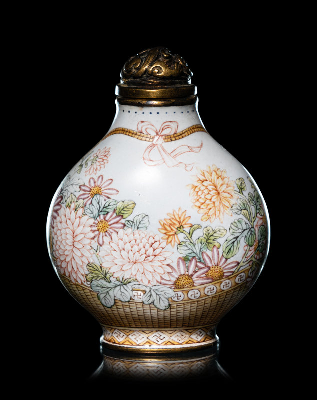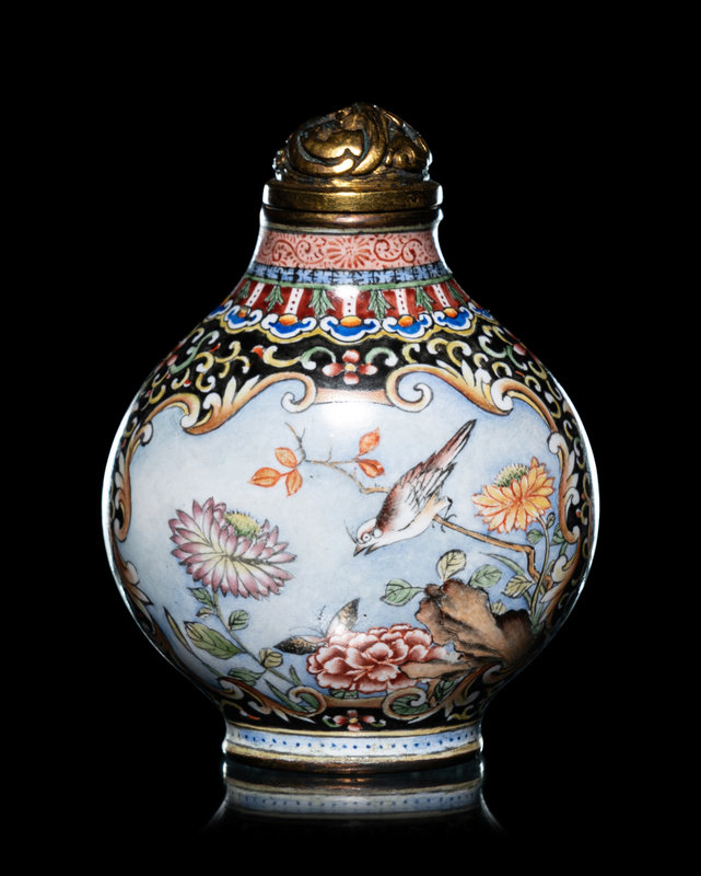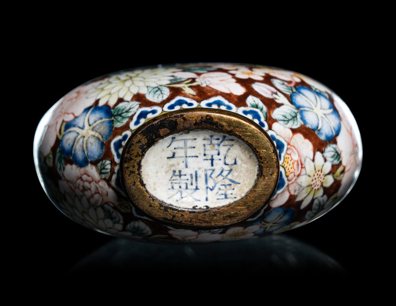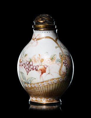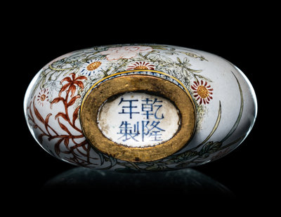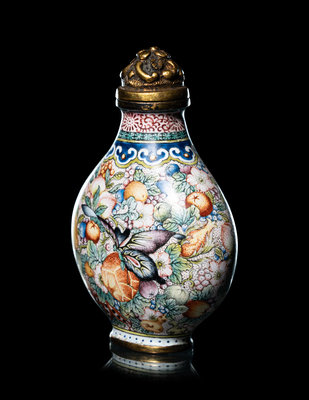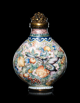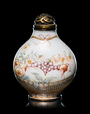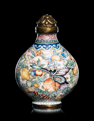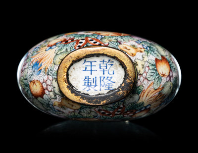 each finely painted with a gilt bronze stopper, comprising three baluster examples, one painted as a weaved basket filled with fruits, the other two depicting birds perched on flowering branches; three flattened examples, the first painted to depict butterflies in midst of melons, fruits and flowers, the second blossoming flower heads, the third a bird resting atop flowering peonies; all bearing Qianlong four-character marks in blue enamel on the underside.