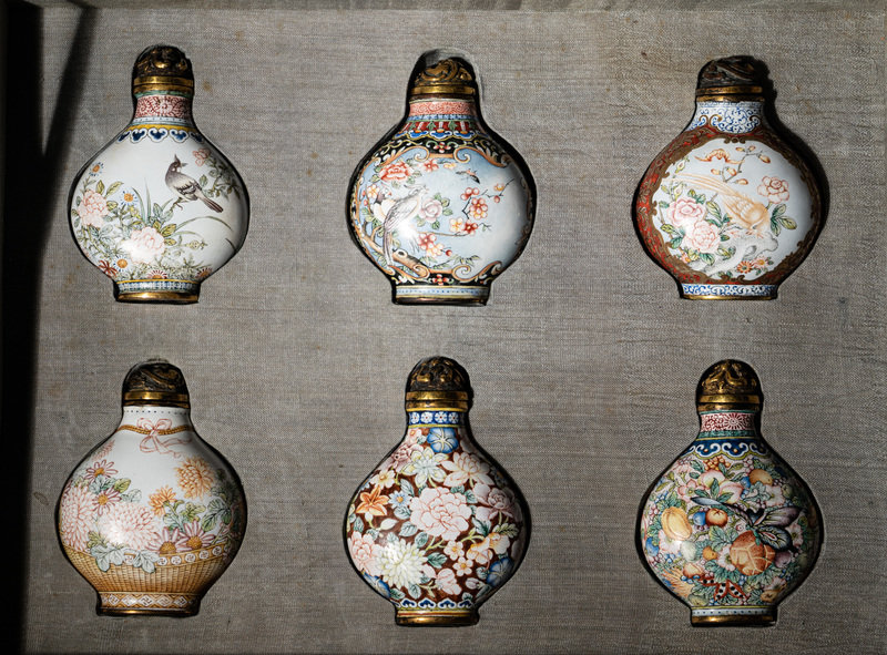 A Set of Six Peking Enamel on Copper Snuff Bottles