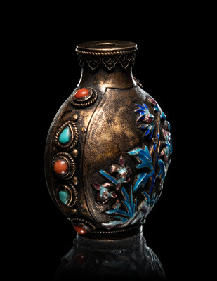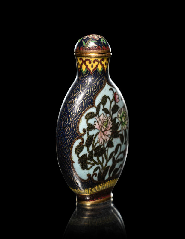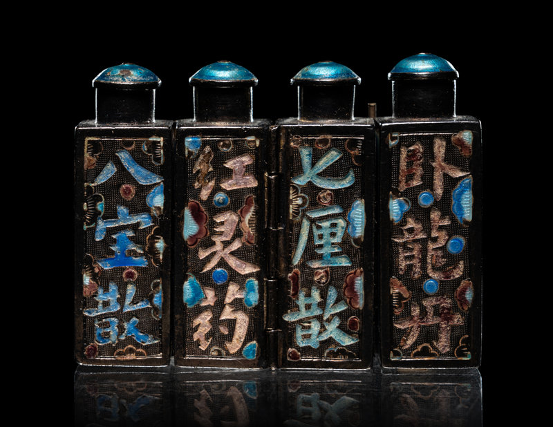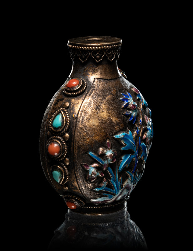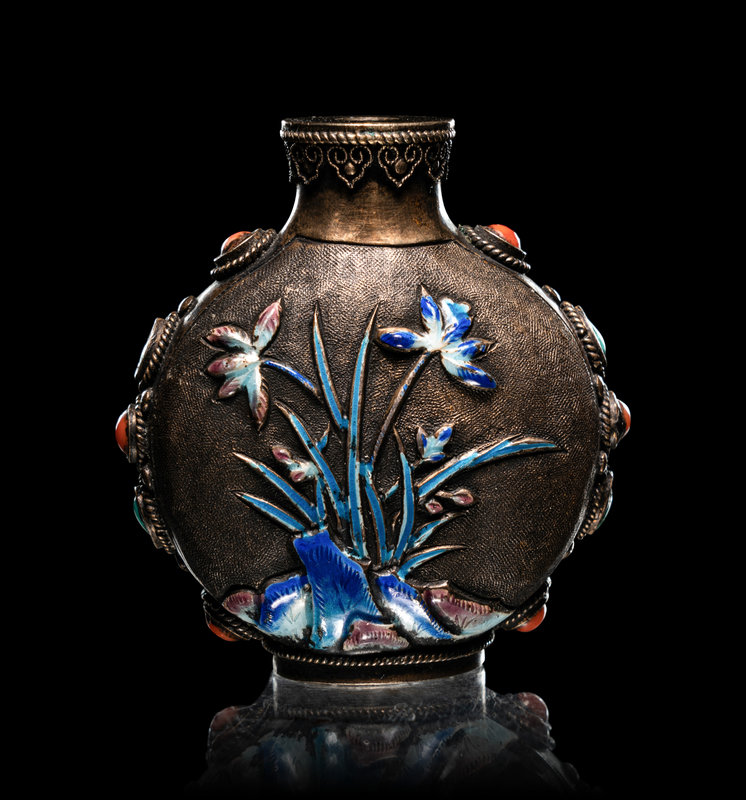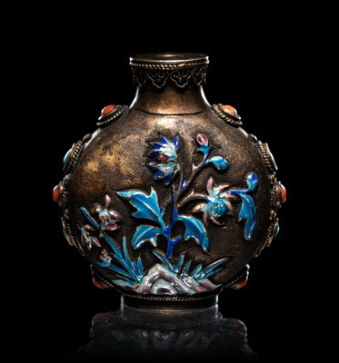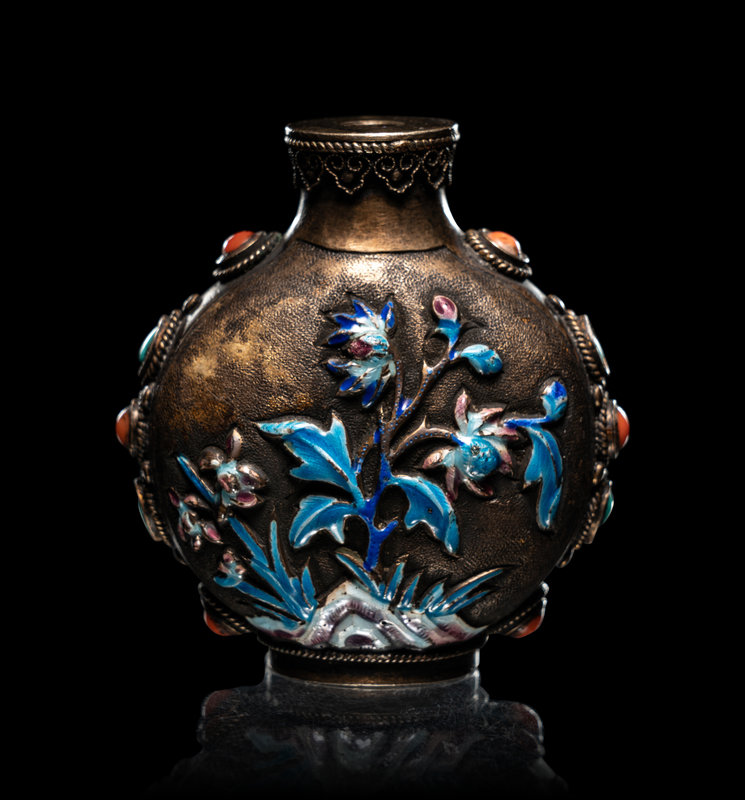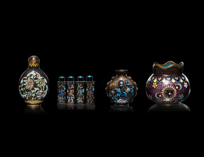 comprising a cloisonné enamel 'floral' snuff bottle, the underside bearing an impressed Qianlong four-character mark within a square panel; a cloisonné globular jar; an enamel on silver 'floral' snuff bottle, and a four-section hinged silver medicine bottle.