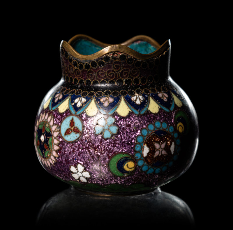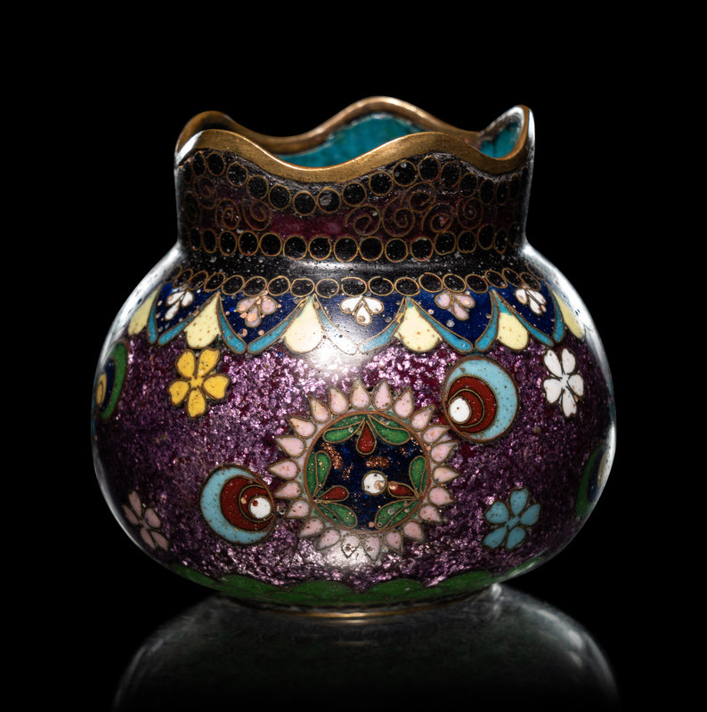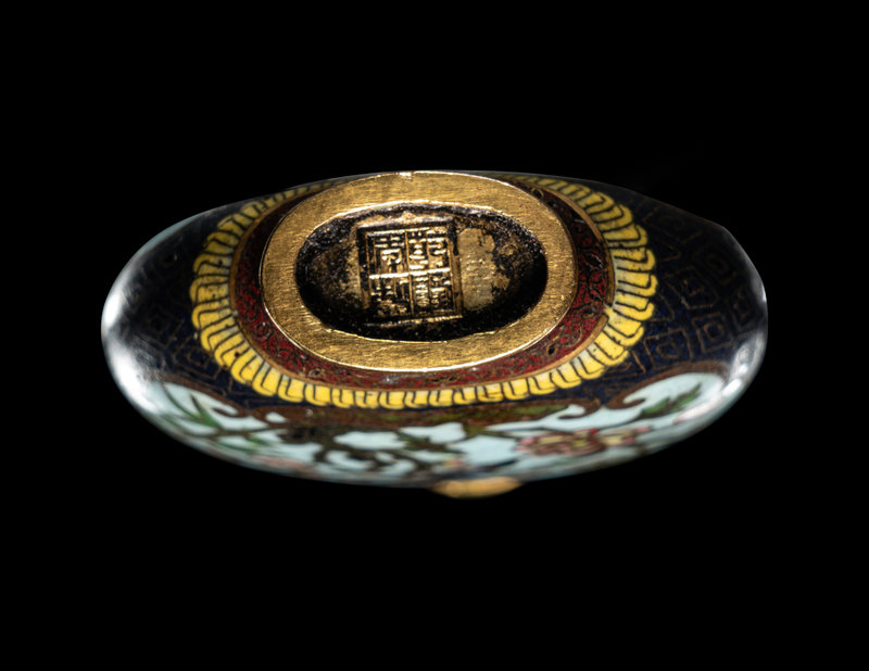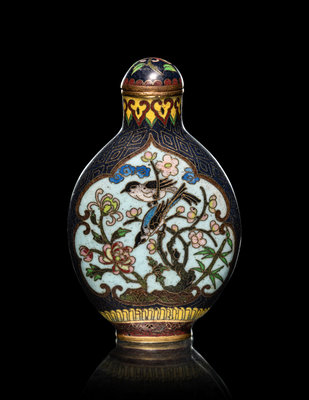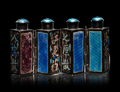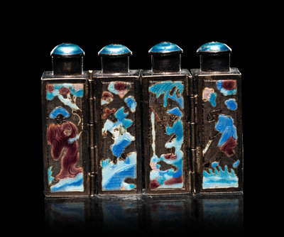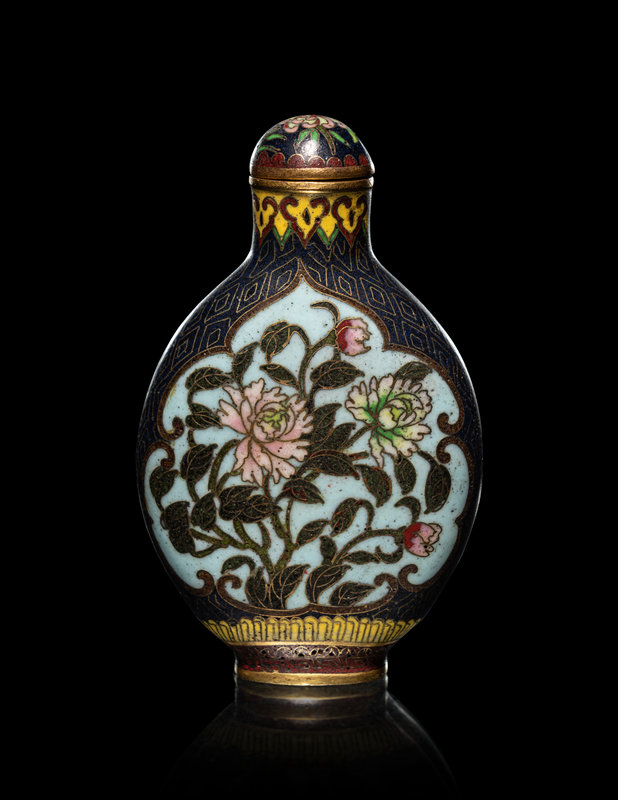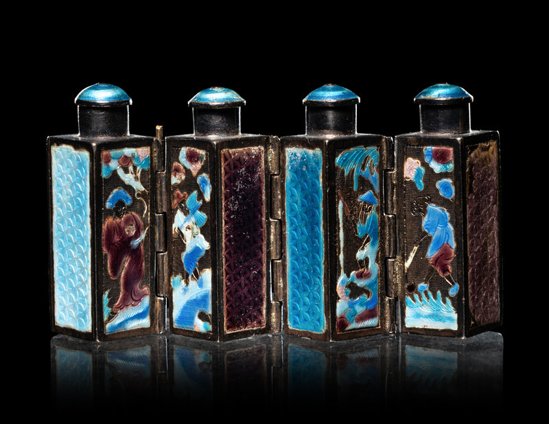 comprising a cloisonné enamel 'floral' snuff bottle, the underside bearing an impressed Qianlong four-character mark within a square panel; a cloisonné globular jar; an enamel on silver 'floral' snuff bottle, and a four-section hinged silver medicine bottle.