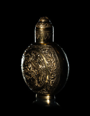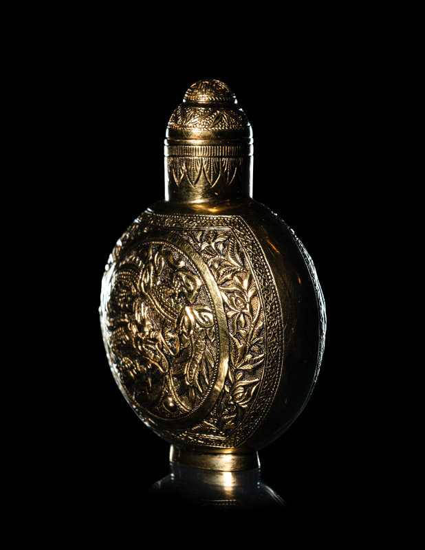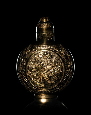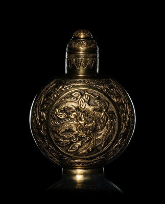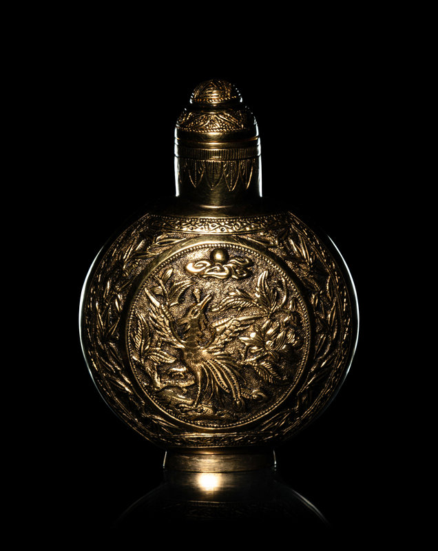 the rounded body chased with dragon and phoenix decoration within rounded reserves, all surmounted by a tapered gold stopper; bearing an apocryphal Qianlong four-character mark to the underside.