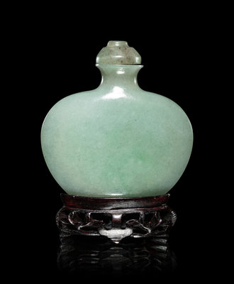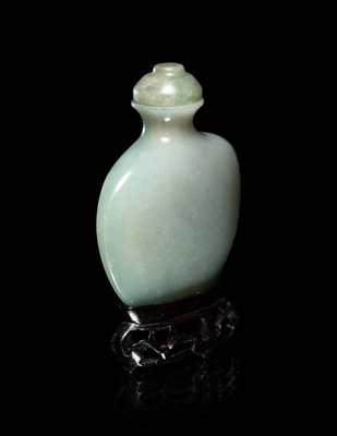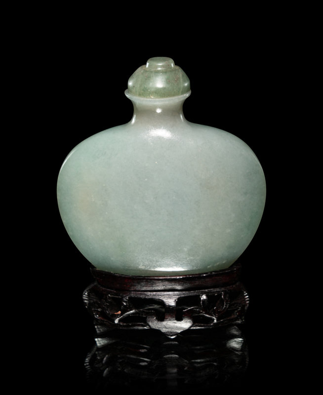 the flattened bottle having plain, smooth sides, the stone of a bluish celadon tone, together with a green hardstone stopper, raised on a fitted hardwood stand.