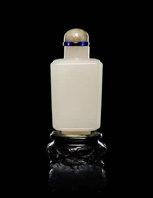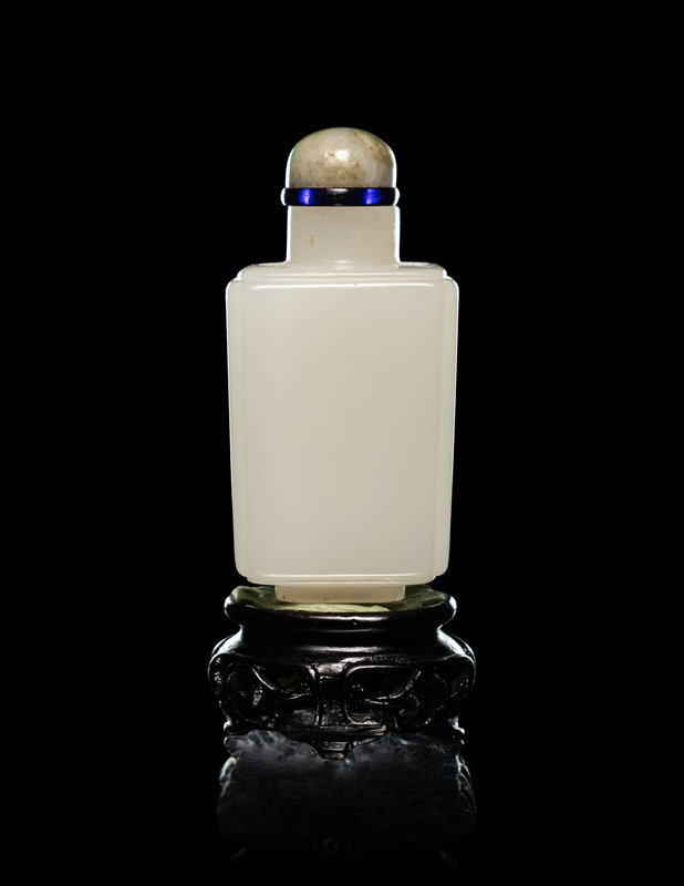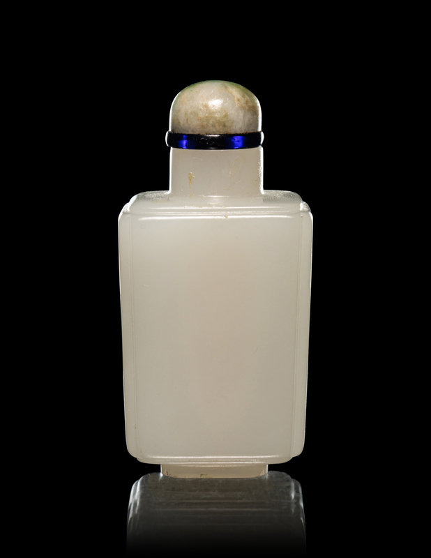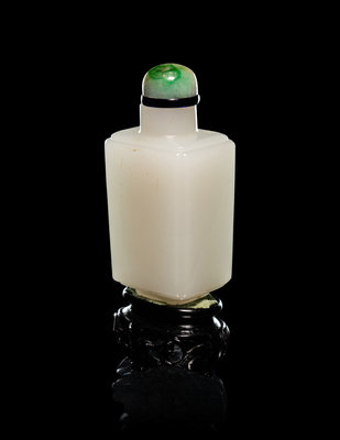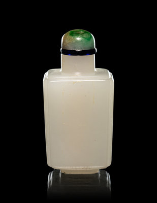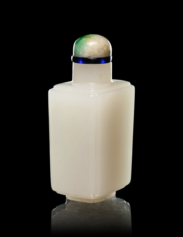 each side of the faceted bottle is framed by a narrow grooved border, raised on a foot of conforming outline, the stone is of even color, together with green jadeite stopper.