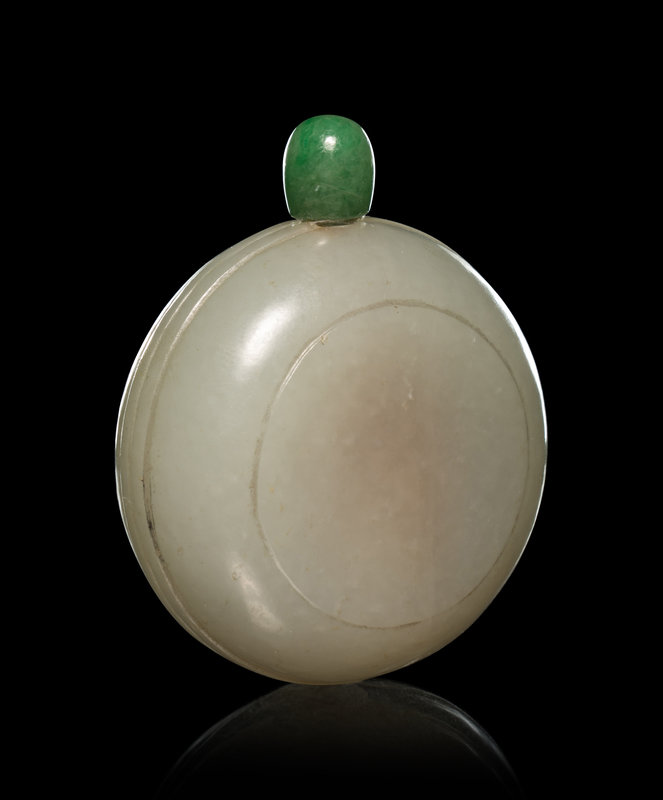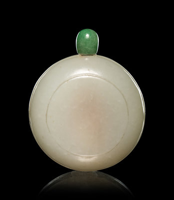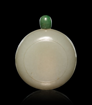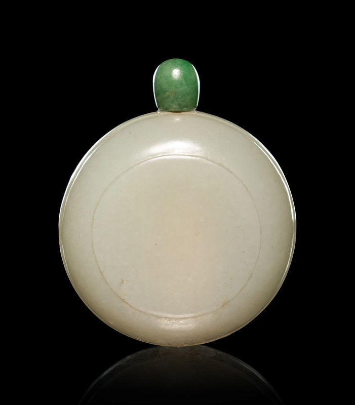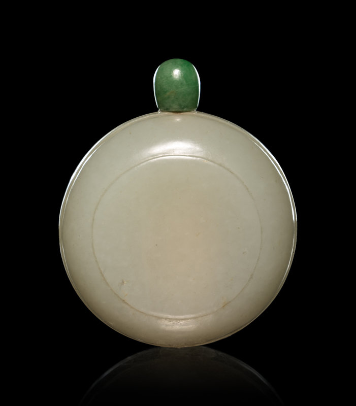 each side of the circular bottle carved with a raided medallion, the stone of an even white tone, together with a green jadeite stopper.